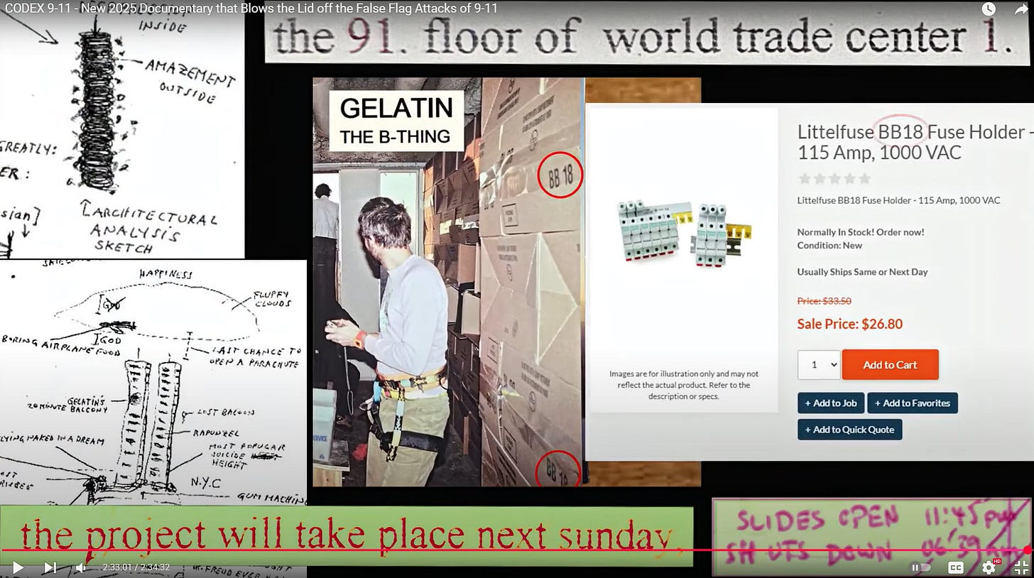The first “artist collective” Gelatin/Gelitin, is also the name of a blasting agent used in controlled demolition. Gelatin/Gelitin team members were photographed in their “studio area” on the 91st floor (9-1) of WTC 1 in front of boxes of BB18 fuse holders. Their “art project” was called “The B-Thing” (Bomb Thing?) and their own drawings appear to show one of the towers collapsing. The project, coincidently, provided the excuse to rent a helicopter and survey the WTC complex prior to the event.