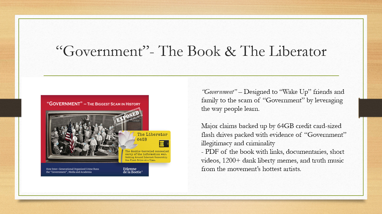 Support us at the $250 Founding Member Level and get a signed high-resolution hardcover of “Government” + Liberator flash drive + Larken Rose’s The Most Dangerous Superstition + Art of Liberty Foundation Stickers delivered anywhere in the world. Our only option for signed copies besides catching Etienne @ an event.