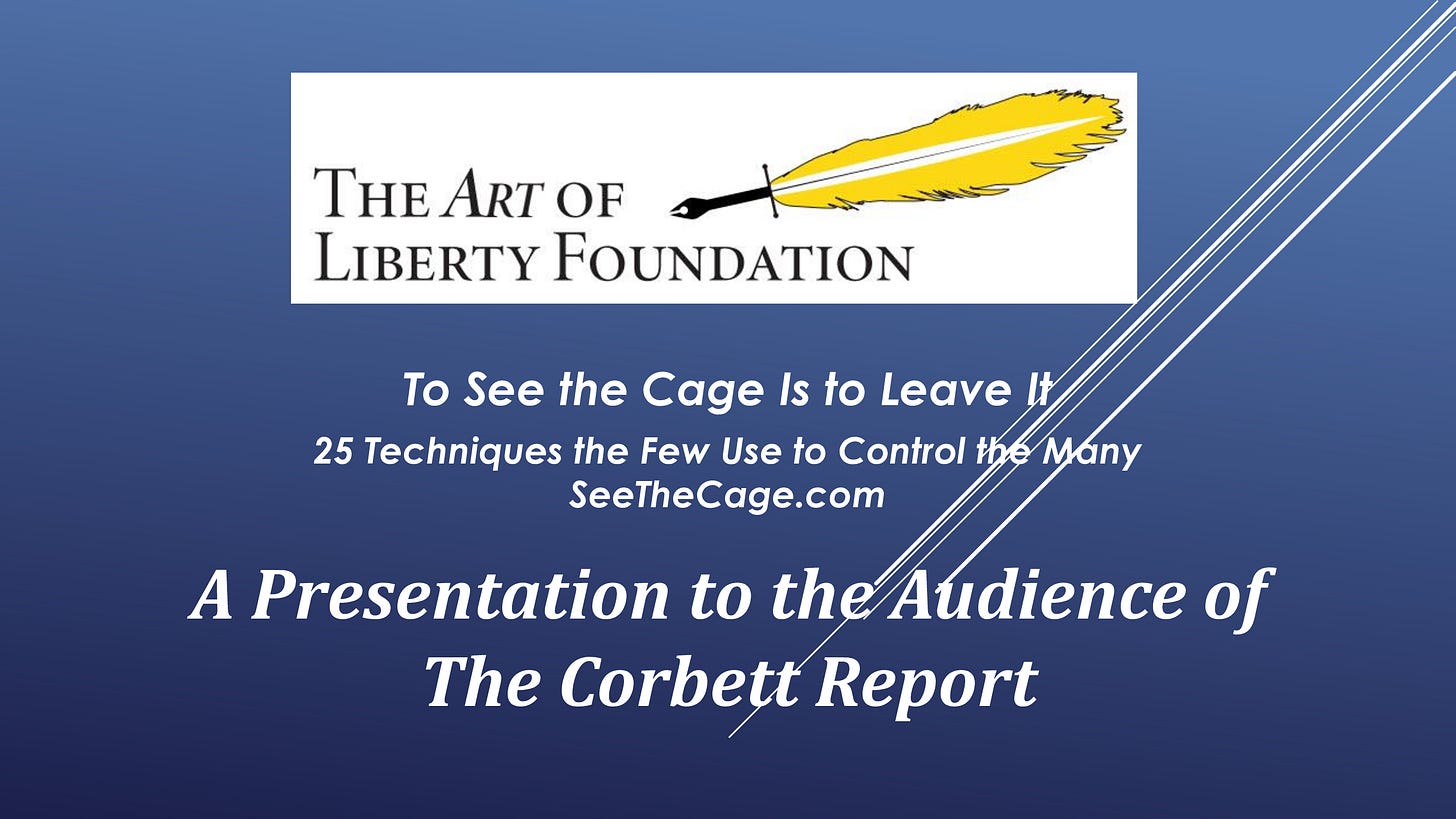 James Corbett: Yes, it is good to be here and talking about something that I think is ultimately empowering and powerful. What am I talking about specifically? Not just a book, but, like our last conversation, we were talking about “Government” - The Biggest Scam in History…Exposed! in which you laid out not just the nuts and bolts of the biggest scam in history, but also as we discussed in that conversation, presented that information in a visual style that is bound to get attention and to get people, even the attention-deficit-addled TikTok generation, interested in flipping through the pages. A perfect coffee table book, if you will. Well, here we are, talking about your next book, To See the Cage Is to Leave It. Tell us about this book, what it is, and why you wrote it.